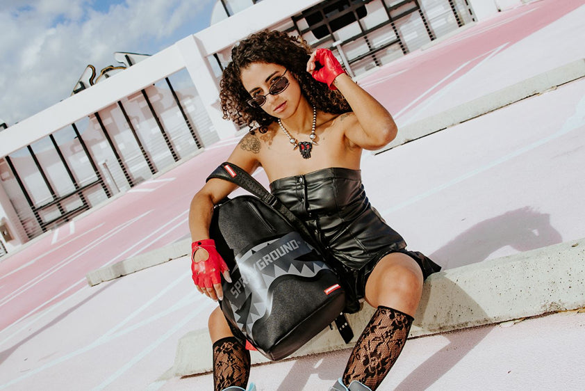 Dimensions: 18" x 6" x 11.5" • Front zipper pocket • Side pockets • Zippered Stash pocket • Separate velour sunglass compartment • Ergonomic mesh back padding • Adjustable Straps for custom sizing • Gold zippers with metal hardware • Metal "Sprayground Authentic" badge • Slide through back sleeve connects to carry-on luggage to free your hands